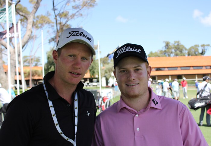 Titleist Brand Ambassador Matt Giles with 2012 Sydney Swans premiership winning player Mitch Morton, talking golf and football on the range.