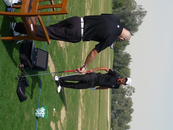 Titleist tech rep Phil "Peej" Dimmock checks some numbers with Titleist ambassador Matteo Manassero