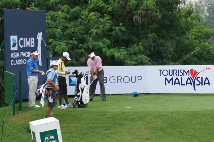 Titleist golf ball loyalists Mardan Mamat and Charlie Wi hit from the 10th tee during their practice round.