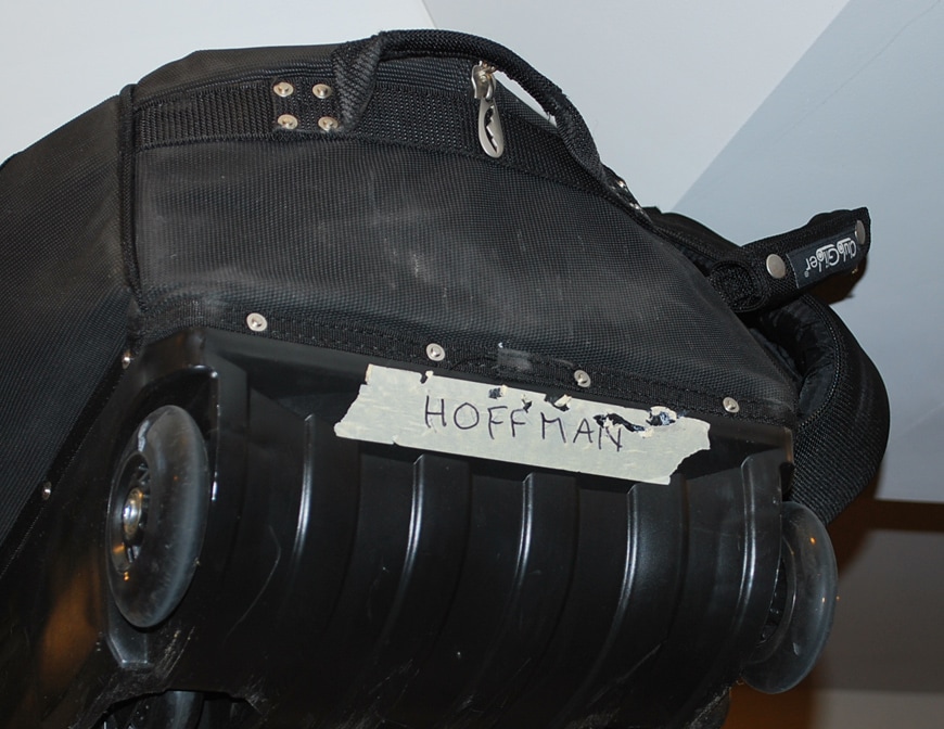 Here's Charley's travel bag, which has more frequent flier miles than most people.