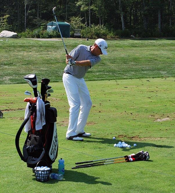 Titleist Brand Ambassador Davis Love III was one of the few sightings on the TPC Boston range Tuesday.