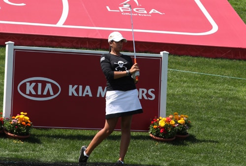Pro V1x loyalist Nicole Hage watches her tee shot on the par-3 16th during a Tuesday practice round.