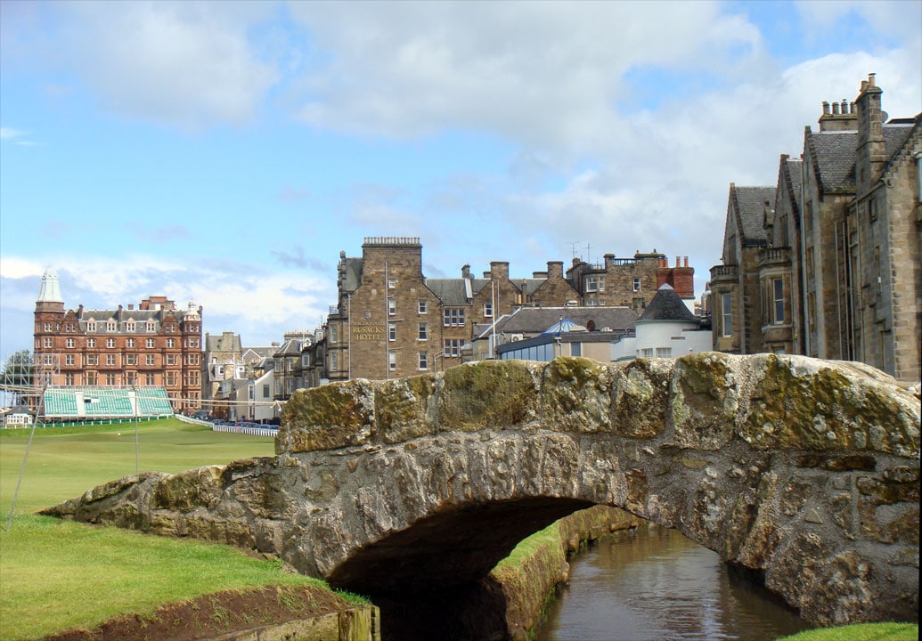 The view from the other side of the Swilcan Bridge, with the town of St. Andrews in the background.