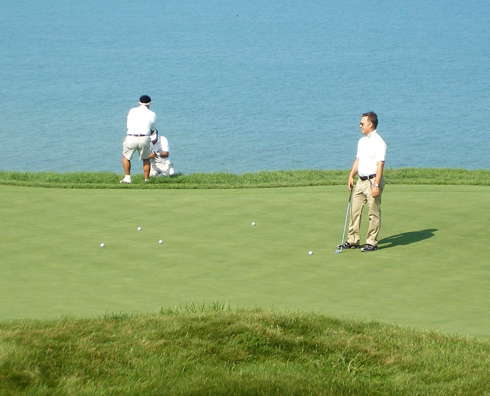 That's Kevin Na trying to climb up the embanking on the left side of the par-3 17th.