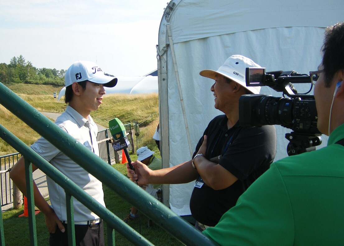 Titleist Brand Ambassador Seung-yul Noh does an interview near the driving range.