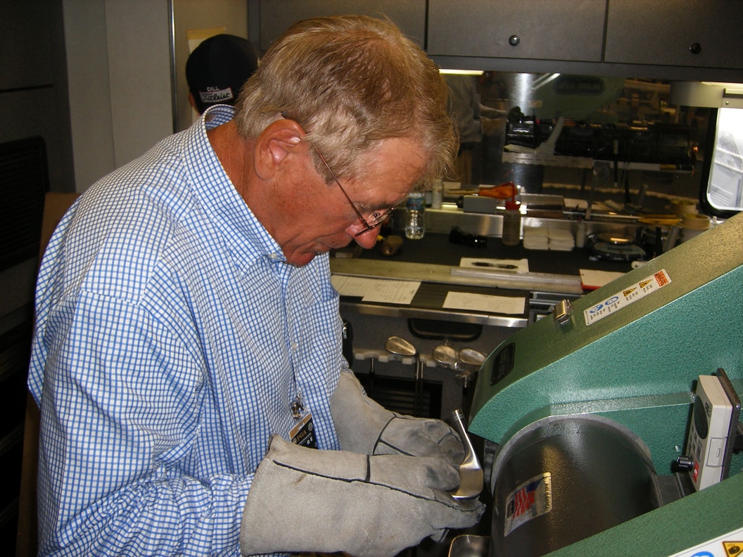 Master Craftsman Bob Vokey works on the grinder inside the Titleist truck.