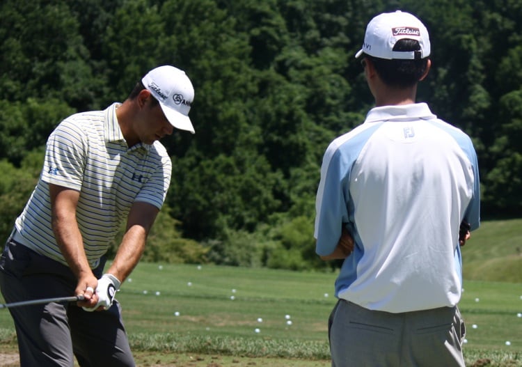 Marni Ines of Titleist Golf Club R&D looks on during Gary's first testing session.