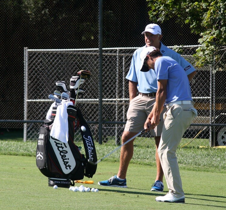 Short game is going to be key this week at The Barclays. Adam Scott gets his reps in before heading out to play a practice round.