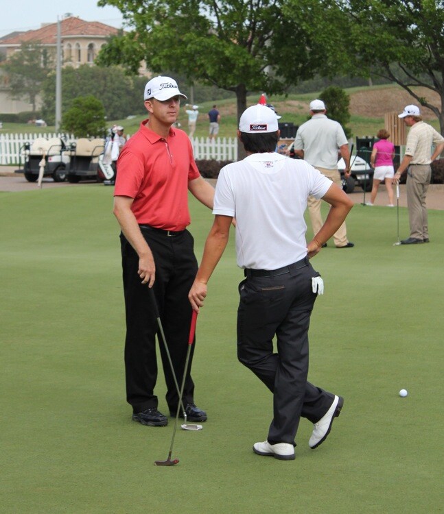 Over at the putting green, Titleist Brand Ambassador Michael Connell chats with a fellow Titleist Brand Ambassador... Guess who?