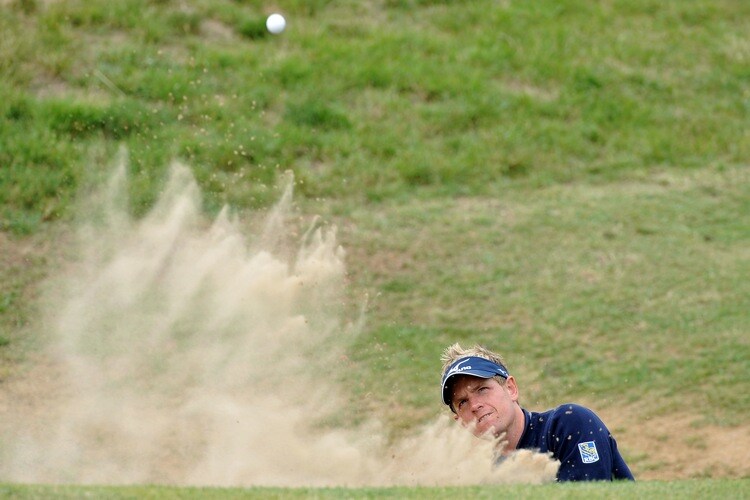 Back out on the course, Pro V1x loyalist Luke Donald blasts out from one of Royal St. George's infamously-deep bunkers.