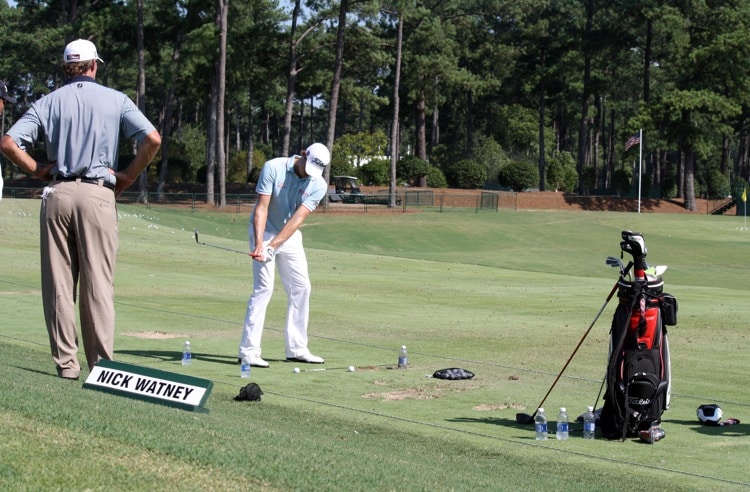 Titleist Brand Ambassador Nick Watney works on a drill Monday afternoon on the range at Atlanta Athletic Club, as Rick Nelson, Titleist's director of wedge development, looks on.