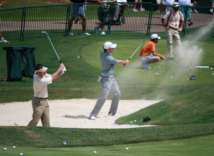 Pro V1x loyalists Mark Wilson (left) and Martin Laird get in some bunker practice.