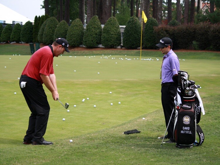 Vokey Tour Rep Aaron Dill works with PGA Professional National Champion David Hutsell in the short-game area.