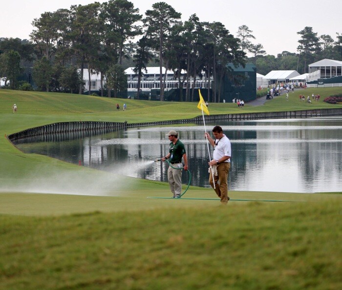 A member of the course maintenance staff hand-waters the 18th green.
