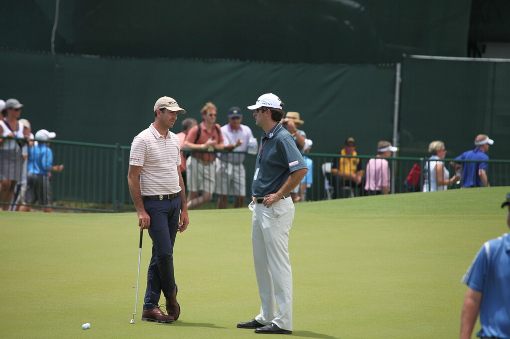 Geoff Ogilvy and Scotty Cameron Tour Rep Kelley Moser talk shop on the practice green. Today's topic, making birdies.