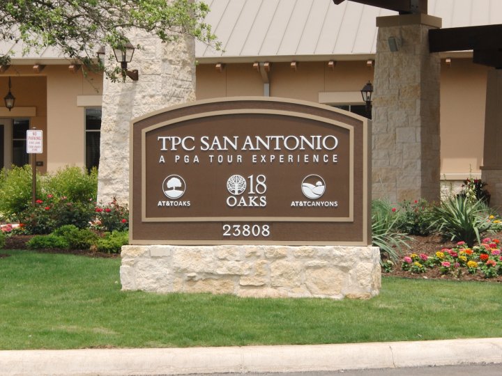 The sign at TPC San Antonio. The TPC San Antonio has two great courses. The Valero Texas Open event is played on the the GregNorman/Sergio Garcia-designed Oaks course. The Canyons Course was designed by Pete Dye.