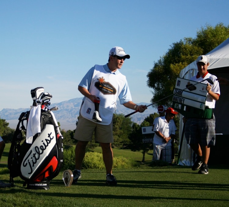 Scott hands Nick his Titleist 910F 15º fairway metal.
