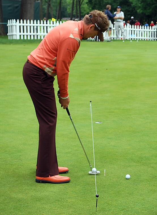 Ian Poulter works on rolling his Pro V1x's to the hole.