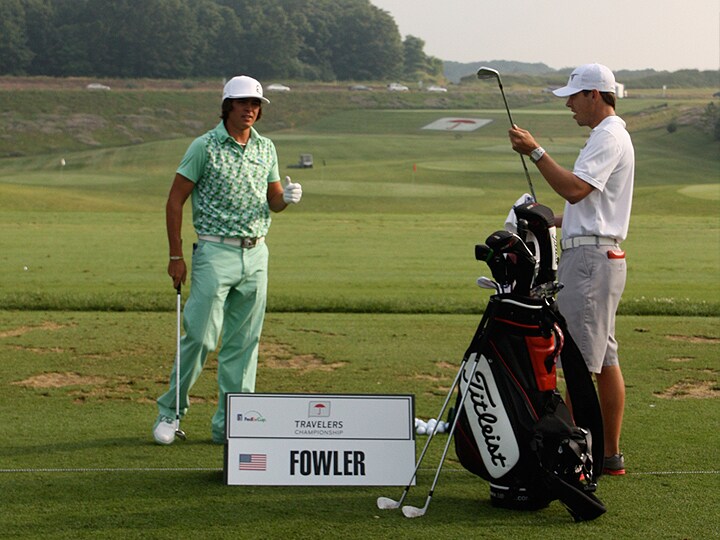 Titleist Brand Ambassador Rickie Fowler chats with caddie Joe Skovron on the range.
