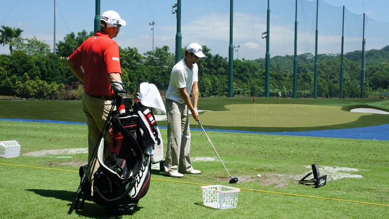 Titleist European Tour Rep Phil Dimmock helping Full Line Ambassador Gregory Bourdy with driver shafts.