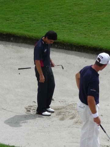 Titleist Brand Ambassador Felipe Aguilar getting some bunker practice in. Felipe is hoping his Pro V1x golf ball will provide him with the control he needs around the greens this week.