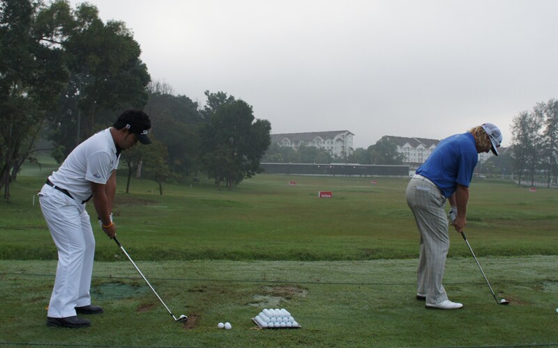 Two Titleist Brand Ambassadors hitting balls next to each other, Chinnarat and Charley Hoffman.