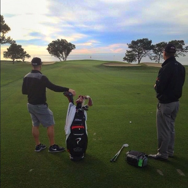 During a practice round, @BenCraneGolf shared this photo of his caddie and coach James Sieckmann taking yardage notes on #1 of the North Course at Torrey Pines.