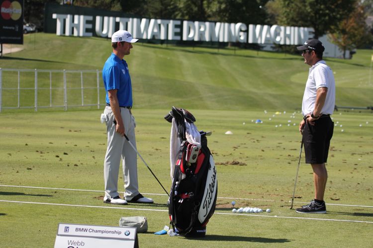 A few spots down, Webb Simpson and his caddie Paul Tesori go over the game plan.