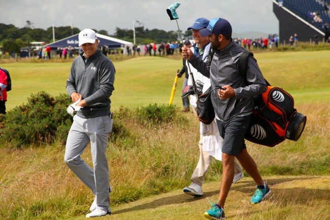 Jordan shares a laugh with his caddie Michael Greller.