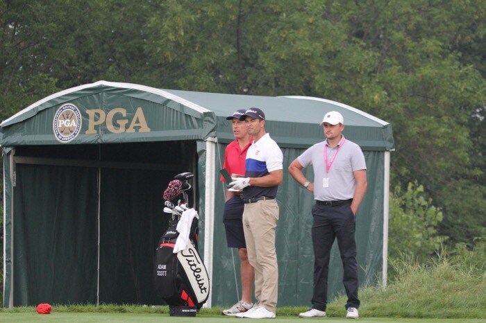 Adam Scott surveys the hole with his caddie, Stevie Williams.