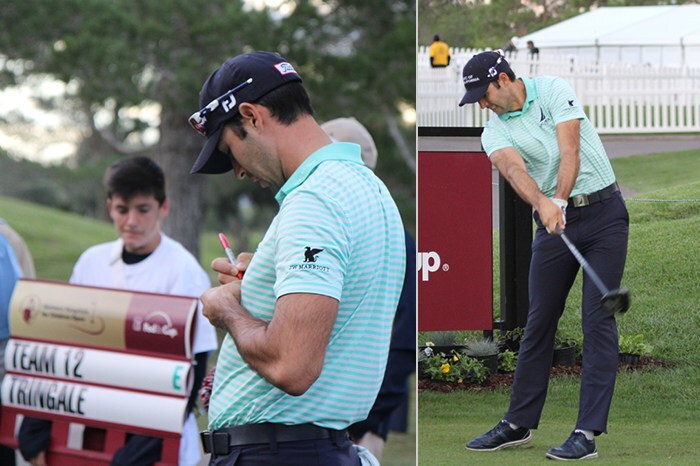 Titleist Brand Ambassador Cameron Tringale preps his Pro V1x golf ball for a long flight off the 1st.
