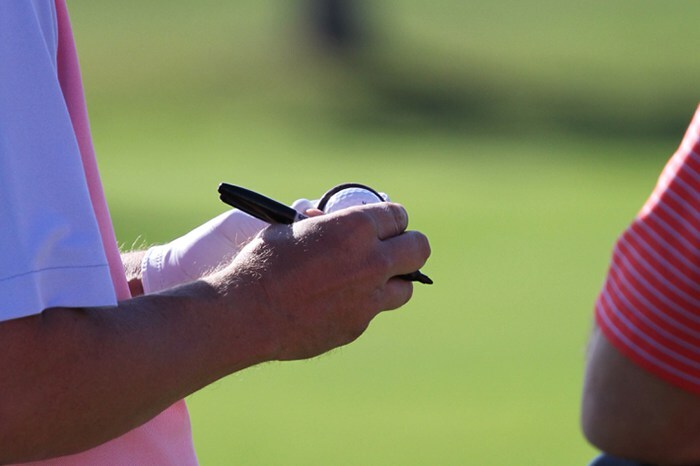 Jason uses this sawed-off piece of PVC pipe as a guide for the alignment line he draws on his Pro V1.