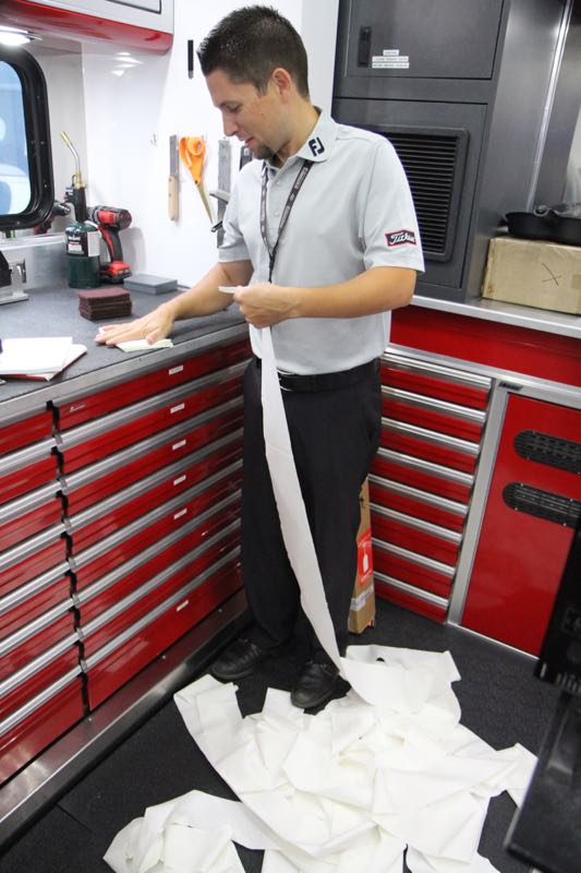 Vokey Tour Representative Aaron Dill prepares a stack of paper towel squares for the busy day of wedge orders ahead.