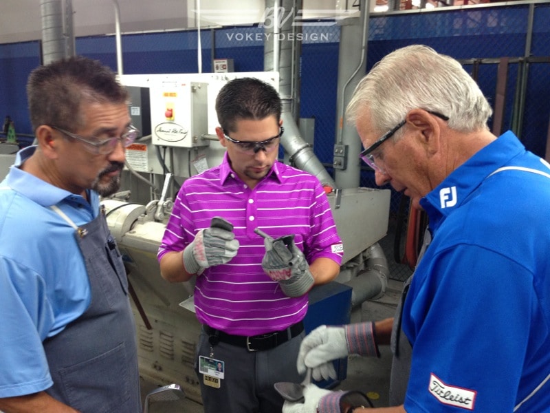 A meeting of the minds… Bob inspects a prototype with Sr. Tour Club Tech Victor Torres (pictured left) and Vokey Tour Rep Aaron Dill (center).